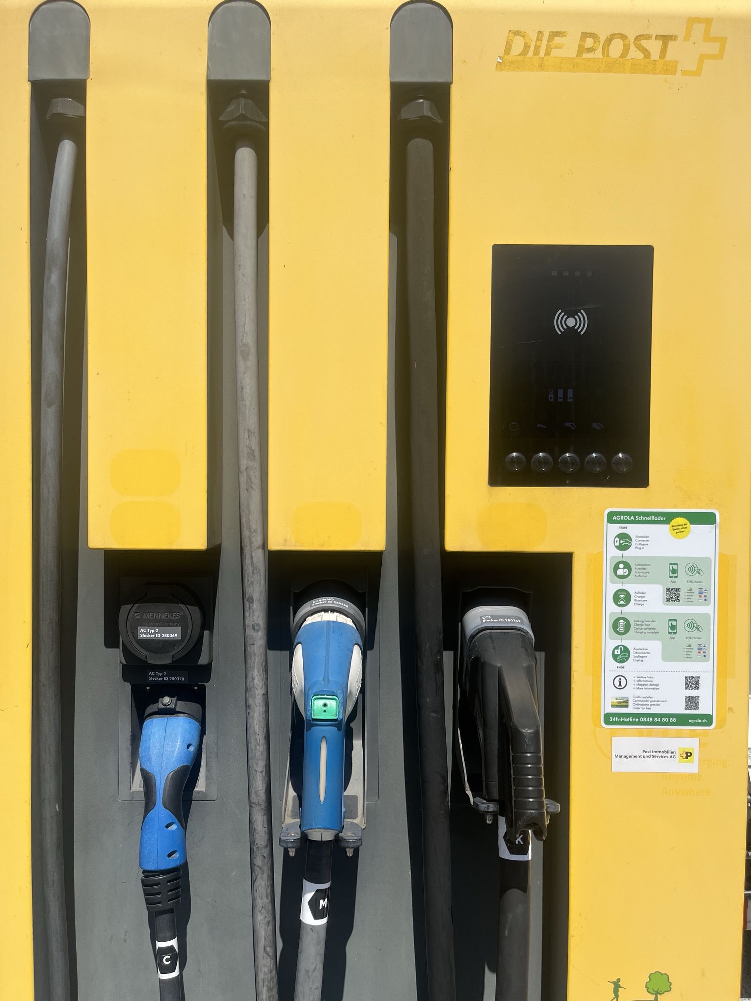 TANKEN SIE ELEKTROMOBILITÄT AUS SOLARENERGIE BEI AGROLA! AGROLA baut ihr Netz an Ladestationen (bis zu 320 kW) ständig aus. Bereits heute laden Sie Ihr Elektrofahrzeug bequem mit Schweizer Solarstrom. Teilweise überdacht finden Sie an den Schnell-Ladestationen zudem TopShop und WC. Geniessen Sie während dem Aufladen einen Kaffee, erledigen Sie Einkäufe, und machen sich dann wieder auf den Weg an Ihr Ziel. Mit der AGROLA e-Mob-App und powercard zahlen Sie ohne Abokosten und könnn diese schweizweit und im Ausland dank der Partnerschaft mit Swisscharge nutzen.